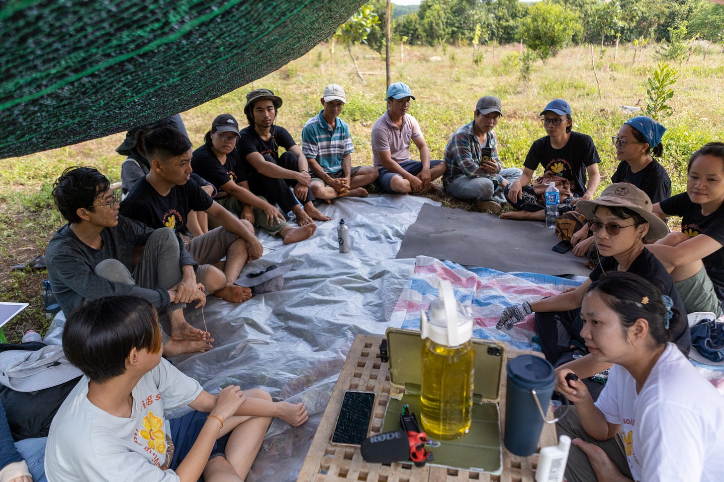 Việc thực hành trên còn được ứng dụng ở cộng đồng Phan Sơn tại rẫy của chị Hương - một cựu học viên khoá SEP diễn ra trong tháng 03 vừa rồi. Với sự góp mặt của rất nhiều dân làng Boon Thóp, mọi người đã hoàn tất con mương chính đi xuyên qua một phần khu đất của chị Hương. Con mương này sẽ thu một lượng nước lớn từ đồi bên cạnh, từ đó phân phối đến các vị trí khác thông qua đường kênh nhỏ hơn. Điều quan trọng trước khi thiết kế một khu vườn, chúng ta cần khảo sát không chỉ thông tin địa lý (hướng gió, lượng mưa, chất đất,...) mà còn phải hiểu bối cảnh kinh tế xã hội của gia chủ (phong tục tập quán, các món ăn truyền thống, giá trị,...). Buổi chia sẻ đã được diễn ra với sự tham gia tích cực và hăng hái từ người dân địa phương.